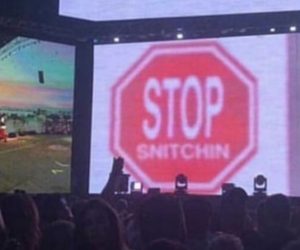 Alors qu’il performait à Coachella 2019, YG avait cette image de 69 en arrière-plan avec écrit « Arrête de snitch » Lire la nouvelle